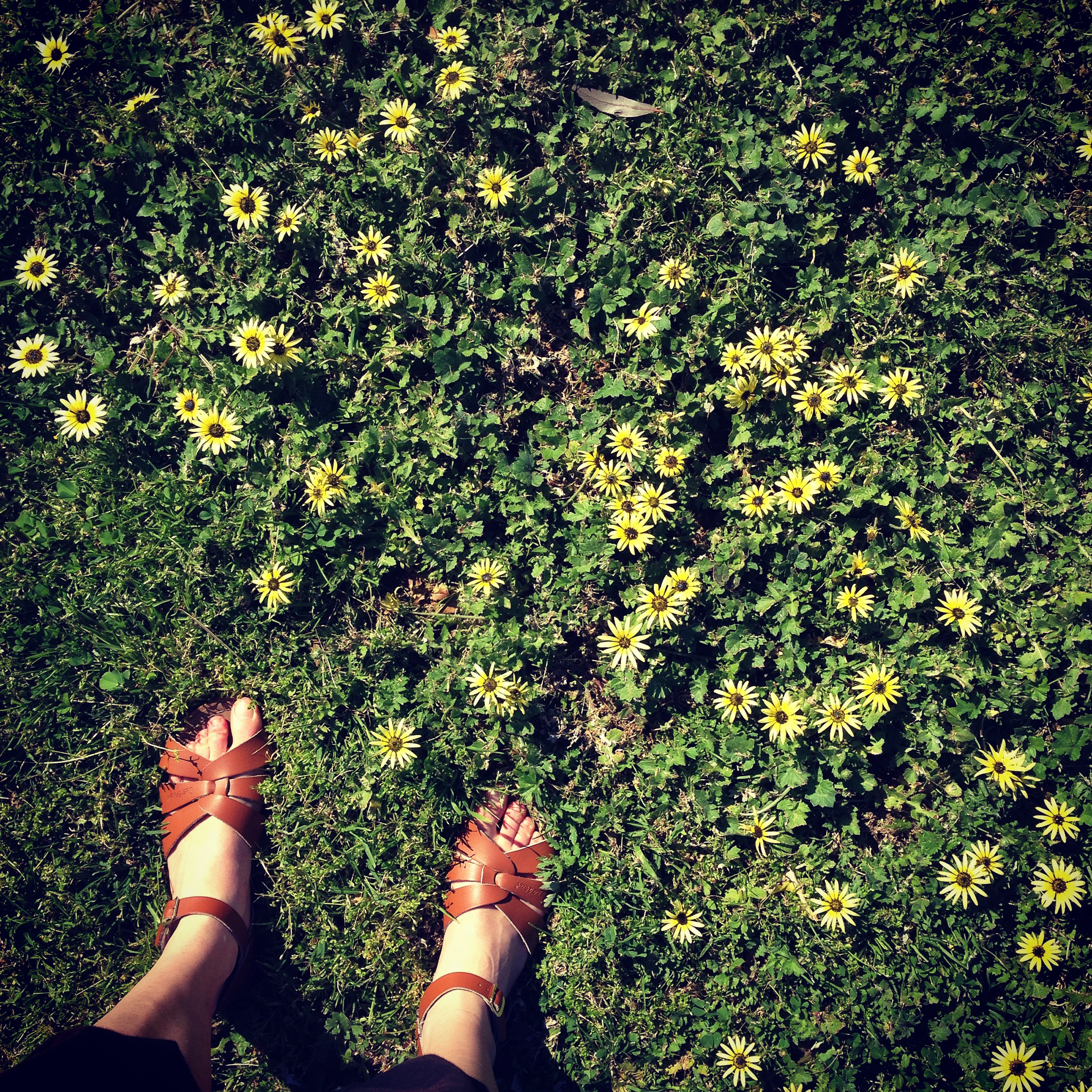I make my way back to standing and walk slowly around the backyard, negotiating the various textures — grass, brick, straw, soil — with my bare feet. They notice as much as my hands and eyes do about the garden. For various reasons, I am consciously teaching my feet to be more aware of and more responsive to the environment I find myself in. I am re-learning how to walk.